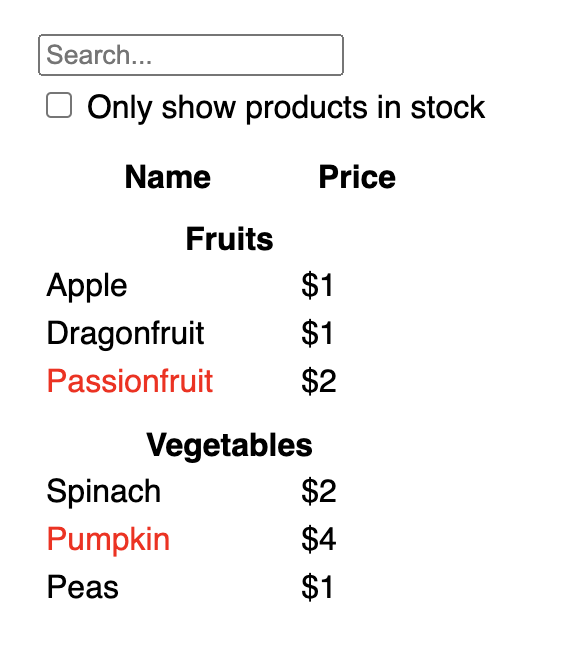 function ProductCategoryRow({ category }) { return ( <tr> <th colSpan="2"> {category} </th> </tr> ); } function ProductRow({ product }) { const name = product.stocked ? product.name : <span style={{ color: 'red' }}> {product.name} </span>; return ( <tr> <td>{name}</td> <td>{product.price}</td> </tr> ); } function ProductTable({ products }) { const rows = []; let lastCategory = null; products.forEach((product) => { if (product.category !== lastCategory) { rows.push( <ProductCategoryRow category={product.category} key={product.category} /> ); } rows.push( <ProductRow product={product} key={product.name} /> ); lastCategory = product.category; }); return ( <table> <thead> <tr> <th>Naziv</th> <th>Cena</th> </tr> </thead> <tbody>{rows}</tbody> </table> ); } function SearchBar() { return ( <form> <input type="text" placeholder="Pretraži..." /> <label> <input type="checkbox" /> {' '} Prikaži samo proizvode na stanju </label> </form> ); } function FilterableProductTable({ products }) { return ( <div> <SearchBar /> <ProductTable products={products} /> </div> ); } const PRODUCTS = [ {category: "Voće", price: "$1", stocked: true, name: "Jabuka"}, {category: "Voće", price: "$1", stocked: true, name: "Zmajevo voće"}, {category: "Voće", price: "$2", stocked: false, name: "Marakuja"}, {category: "Povrće", price: "$2", stocked: true, name: "Španat"}, {category: "Povrće", price: "$4", stocked: false, name: "Bundeva"}, {category: "Povrće", price: "$1", stocked: true, name: "Grašak"} ]; export default function App() { return <FilterableProductTable products={PRODUCTS} />; }